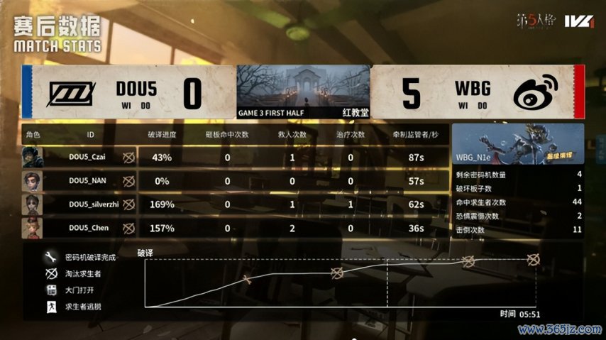 DOU5的求生者选拔了入殓师、空军、“脱逃众人”、病患(BAN歌剧演员);北京WBG的监管者N1e选拔了孽蜥。(BAN先知、时势学家、失火造访员、遨游家)